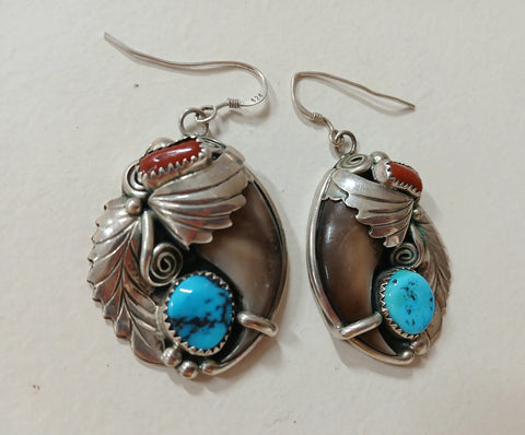 Native American crafted bear claw earrings. Navajo. Sterling silver. Each earring features 1 bear claw approx 1.25 inch set in sterling silver with 1 Arizona/New Mexico turquoise (pyrite inclusions and dark matrix) and 1 red coral. Earring measurements overall is 1.5 inch x 1 inch not including hooks. Earrings dangle on sterling silver hooks. This is an estate piece, in very good condition, however the hooks are slightly bent from normal wear. Sold as a pair.