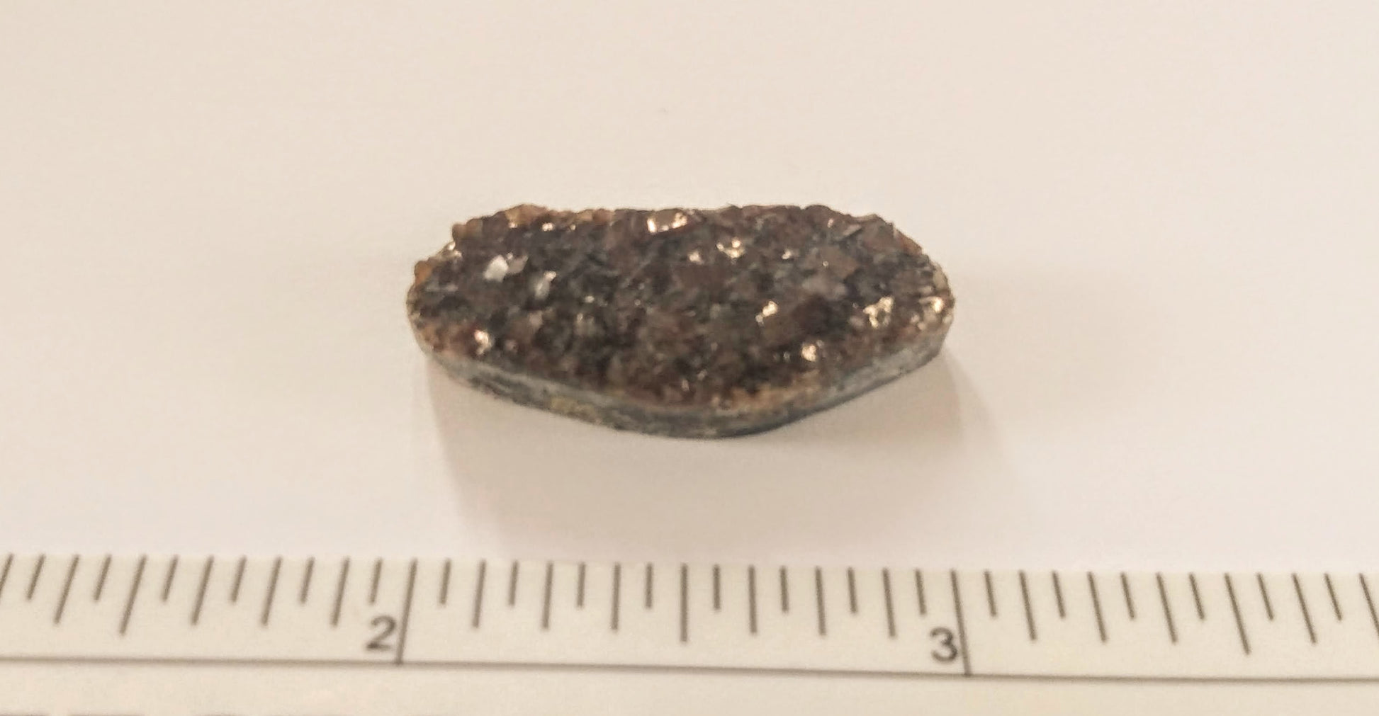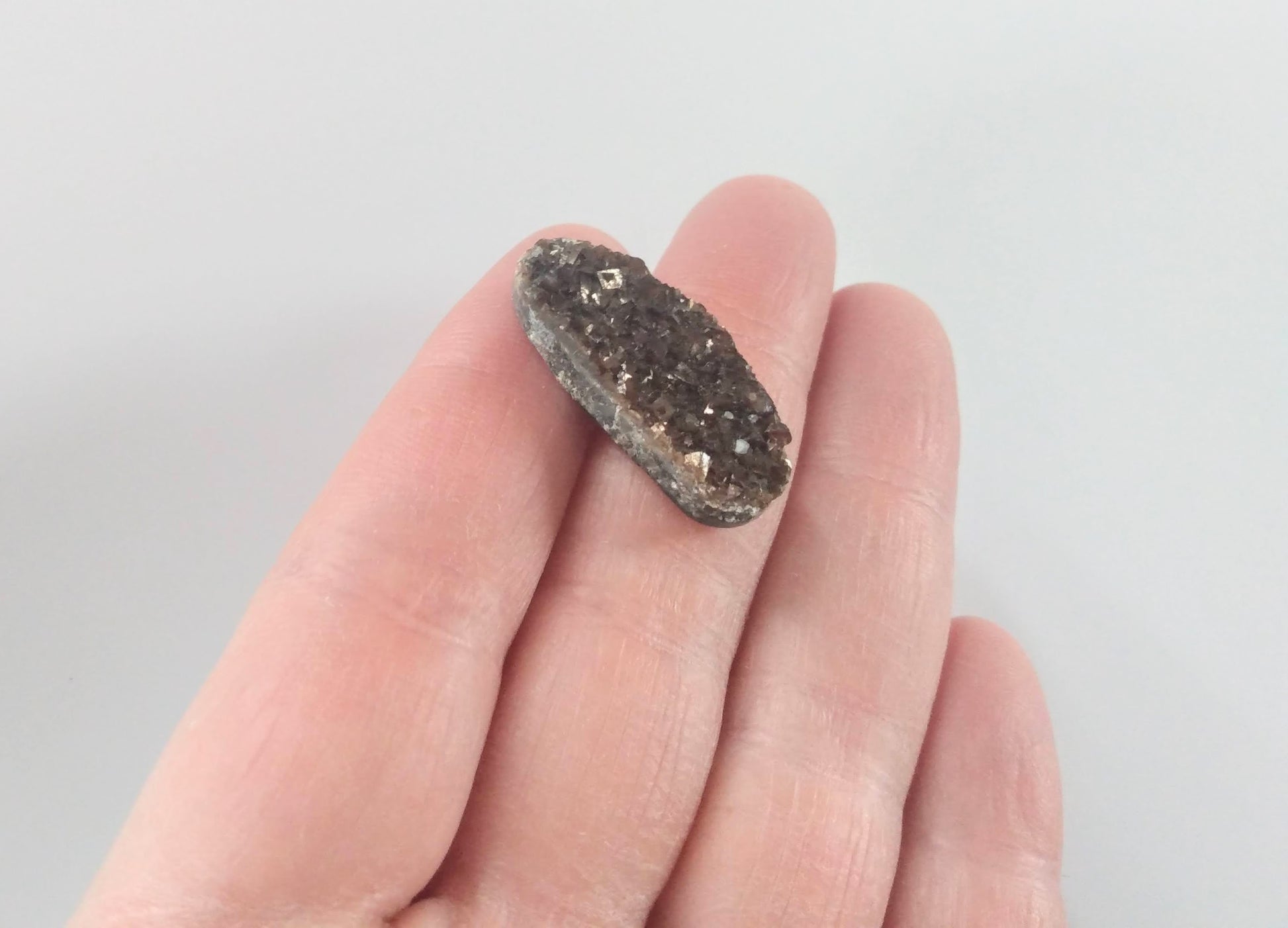 golden brown fluorite "druzy". Nice specimen for jewelry or micro-specimen collection. Color reminds me of root beer with some iridescent sparkle. Approximately 1 inch in largest dimension. Cluster of tiny cubic fluorite crystals.